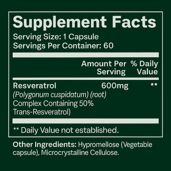 Ingredients: Resveratrol (Polygonum cuspidatum)(root) Complex Containing 50% Trans-Resveratrol, Hypromellose (vegetable capsule), Microcrystalline Cellulose.